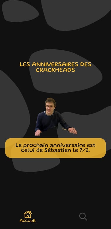 Bon... Comme je déteste oublier les anniversaires et que j'avais envie d'apprendre à coder une application mobile pour Android, j'ai fait d'une pierre deux coups en codant une application en Dart qui me permettait d'être prévenue des prochains anniversaires de mes amis mais aussi de pouvoir chercher leur date d'anniversaire à partir de leur prénom. J'ai fait tous les designs et le développement de A à Z. La légende dit qu'il m'arrive encore d'oublier malgré tout...