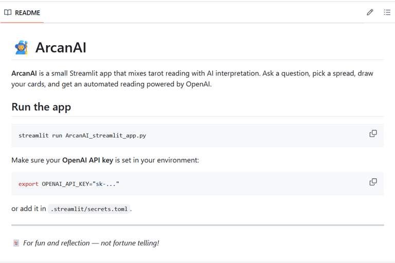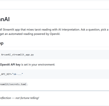 ArcanAI est un assistant au tirage de carte 🧙♀️ C'est application Streamlit qui mêle tirage de tarot et interprétation par LLM. Posez une question, choisissez un tirage, piochez vos cartes et obtenez une lecture automatisée ! Le code est dispo ici.
