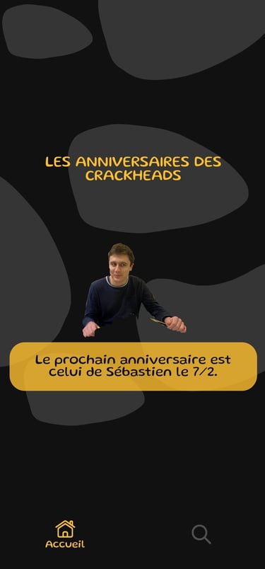 Well... Since I hate forgetting birthdays and wanted to learn how to code a mobile application for Android, I killed two birds with one stone by coding an app in Dart. This app notifies me of the upcoming birthdays of my friends and also allows me to search for their birthdays by their first names. I did all the design and development from A to Z. Legend has it that I still occasionally forget despite everything...